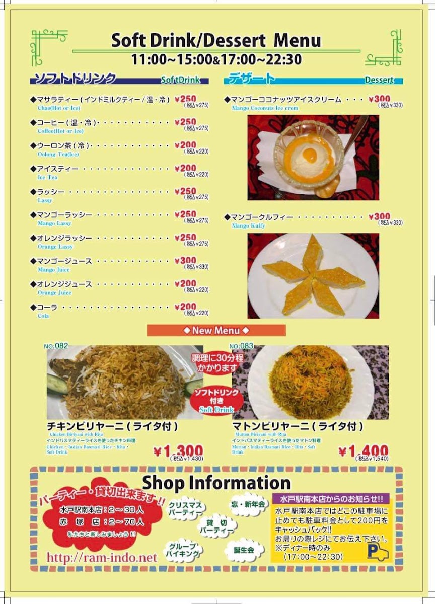 Welcome to Indian Restaurant Ram Mito, a hidden gem nestled in the heart of Ibaraki, Japan. This delightful eatery is renowned for its authentic Indian cuisine, combining traditional and fusion flavors to tempt your palate. The menu offers a diverse array of customizable set meals, allowing diners to select their favorite curries. Each dish is crafted with care, ensuring generous portions and vibrant flavors.